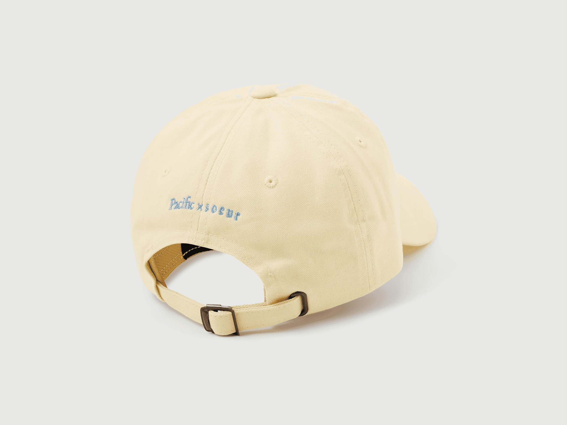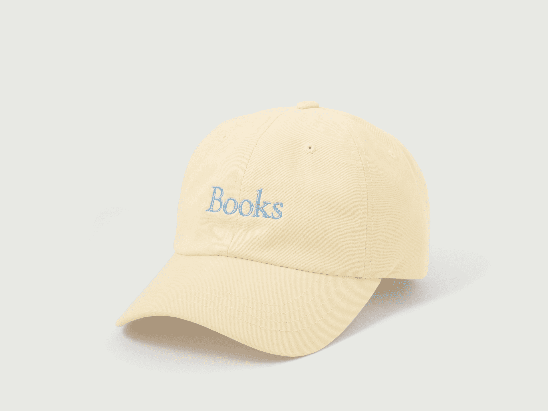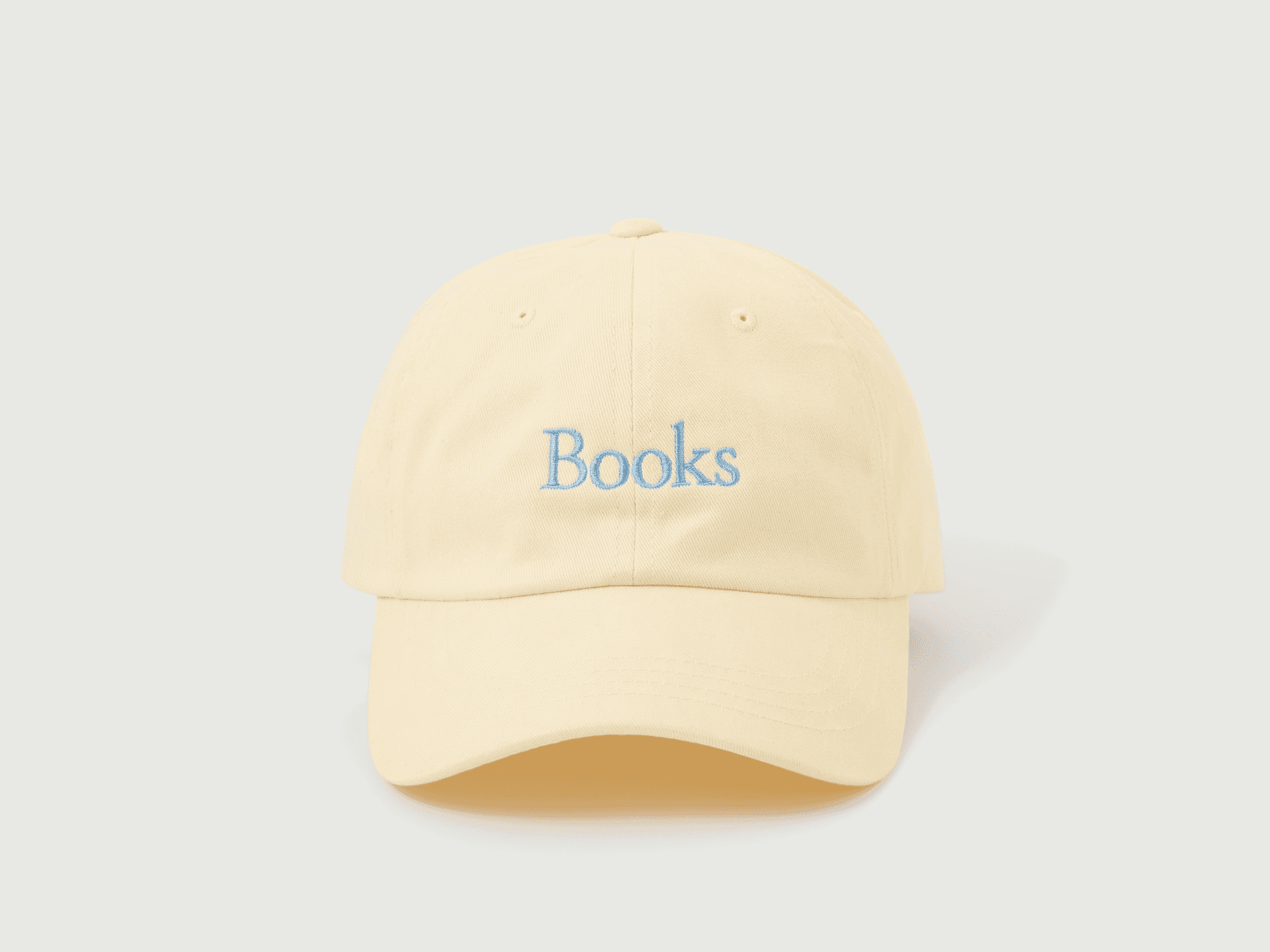 Exclusive buttercream colorway of our "Books" hat made specially for our collaboration with Soeur. This rare take on our "Books" hat features delicate sky blue embroidery (perfect for spring!). This is a limited edition product.