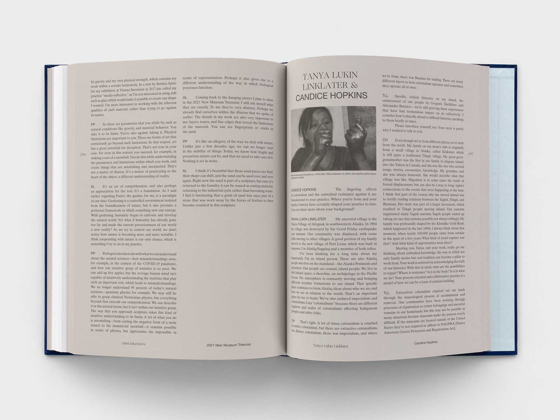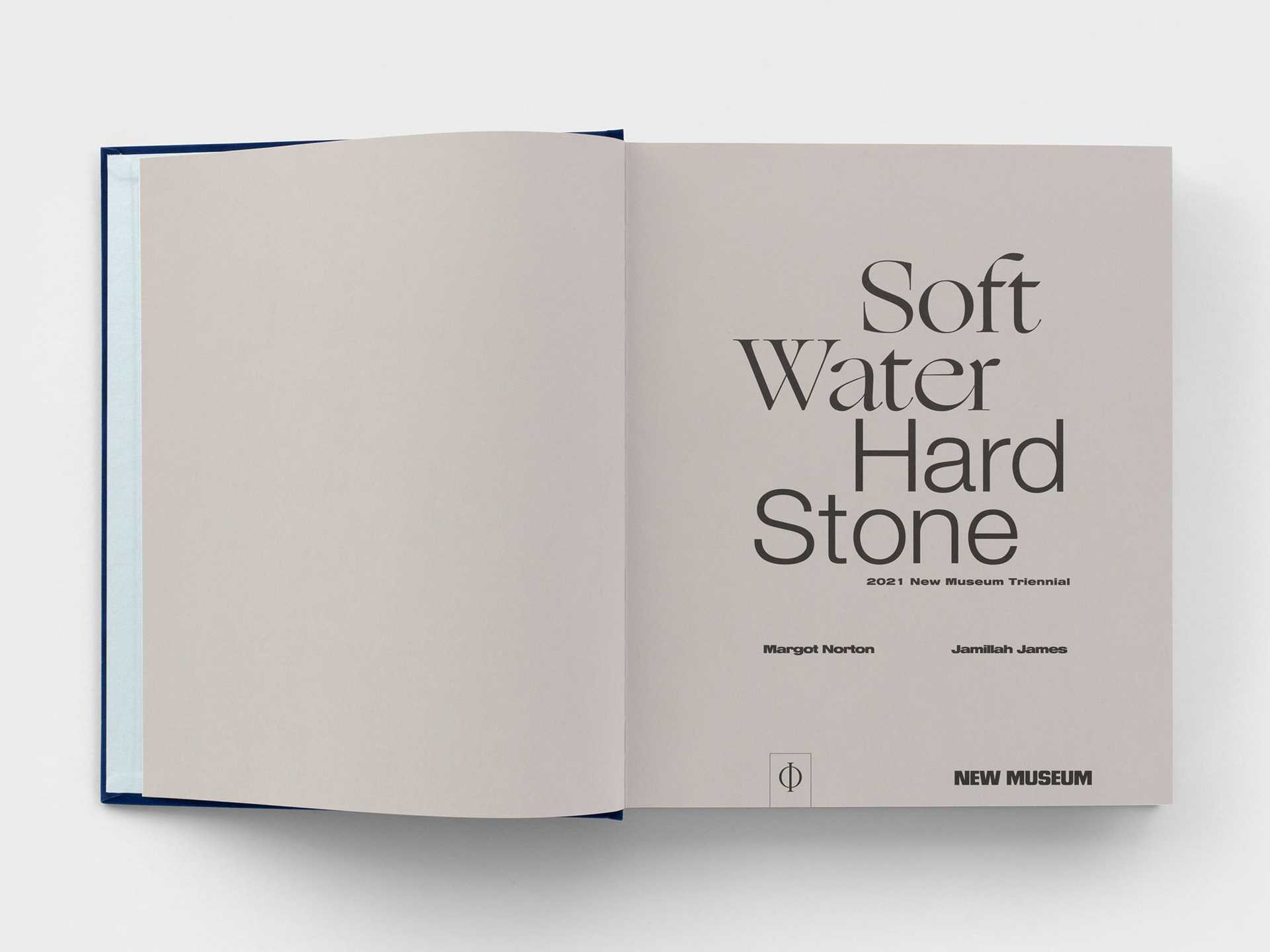 Soft Water, Hard Stone is an illustrated catalogue co-published by the New Museum and Phaidon Press Limited, and designed by Pacific to accompany the triennial exhibition of the same name at the New Museum. It includes contributions from Jamillah James, Margot Norton, Karen Archey, Eunsong Kim, and Bernardo Mosqueira, and features original interviews with all forty artists participating in the exhibition.