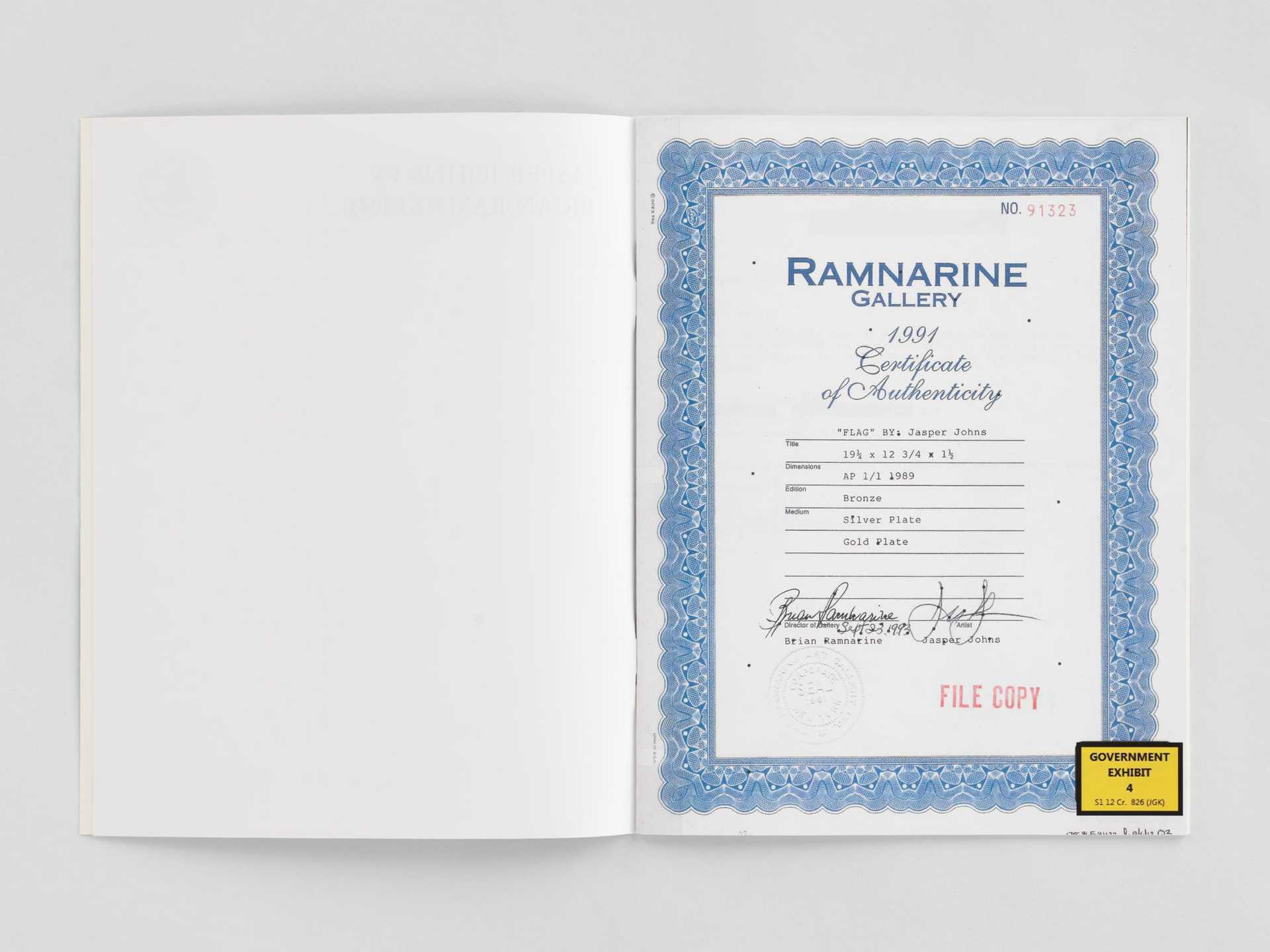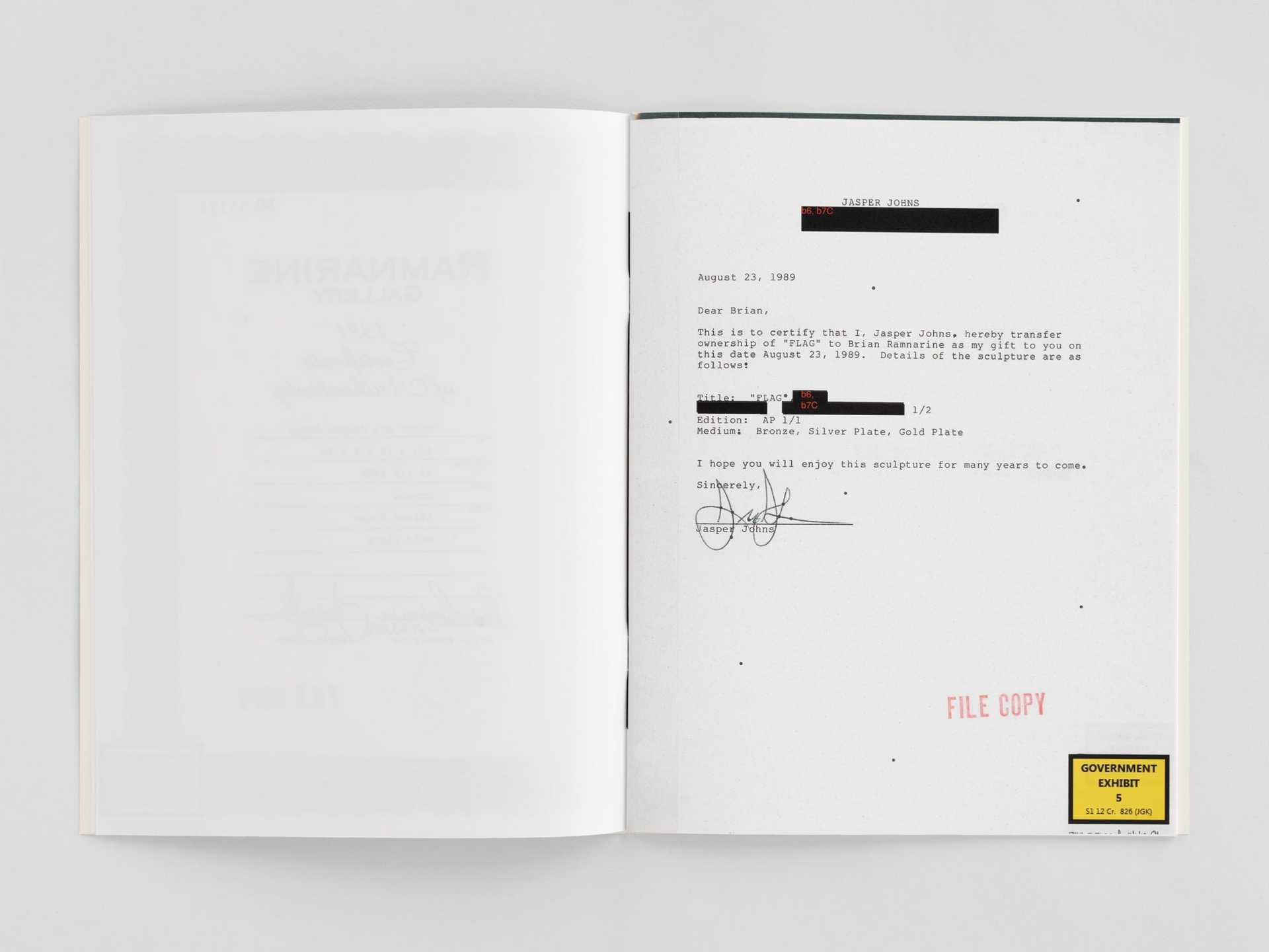 The document outlines fake letters of authenticity, forged correspondence from Johns, and images of the artist’s work that Ramnarine wrongfully produced and sold. Ramnarine was convinced and jailed in 2014 by the United States Government.