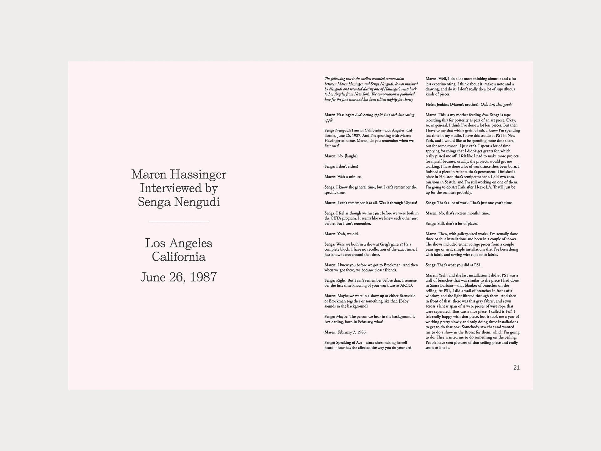 Newly commissioned essays by critics, curators and artists trace the performative and conceptual working method of the two artists in distinct historical periods. The book includes a never-before-published 1987 conversation between Hassinger and Nengudi; an extensive oral history between the artists and their longstanding supporters, curators Lowery Stokes Sims and Leslie King Hammond; and original essays by the volume’s editor and exhibition curator Allie Tepper, critics Kemi Adeyemi and Sampada Aranke and artist Steffani Jemison—all of whom expand upon the artists’ crucial system of support that persisted in periods of institutional neglect. A complete annotated chronology of the artists’ collaborations, as well as exhibition histories, also accompany the book.