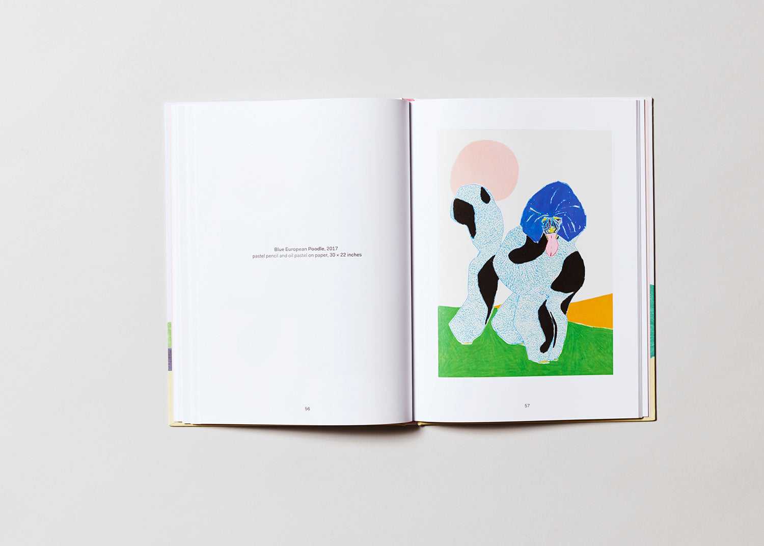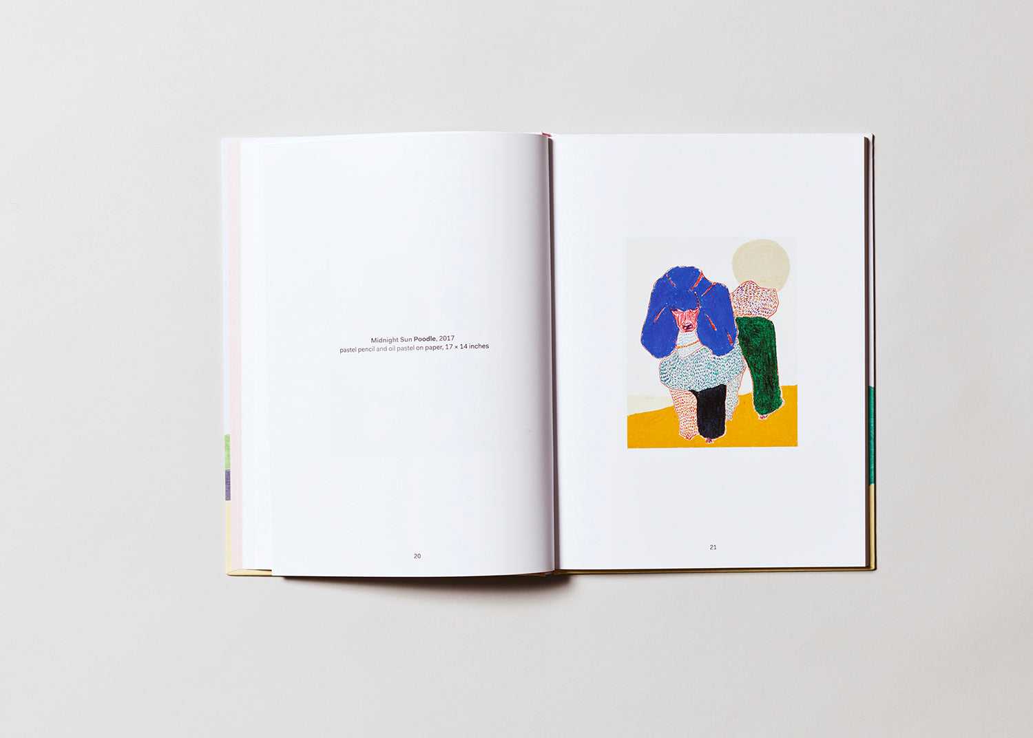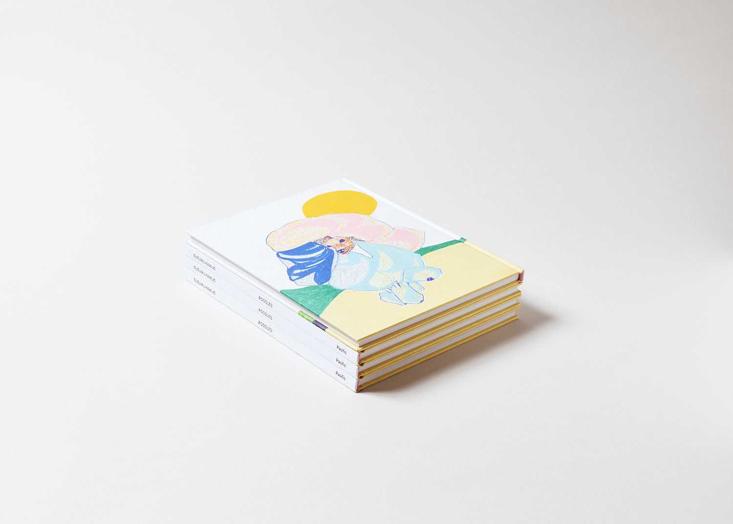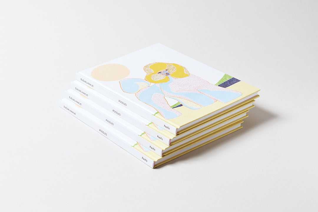 Poodles, Susumu Kamijo’s first publication, presents 48 brightly-colored drawings of poodles, based on images sourced from the Internet and dog-centric magazines. The various poodles convey subtle emotive impressions as informed by their color scheme and line-work—some appear majestic, others coy, and some more wary. Regardless of the feeling generated by each artwork, Kamijo’s combination of pastel pencil and oil pencil renders the poodle in a prismatic and playful manner.