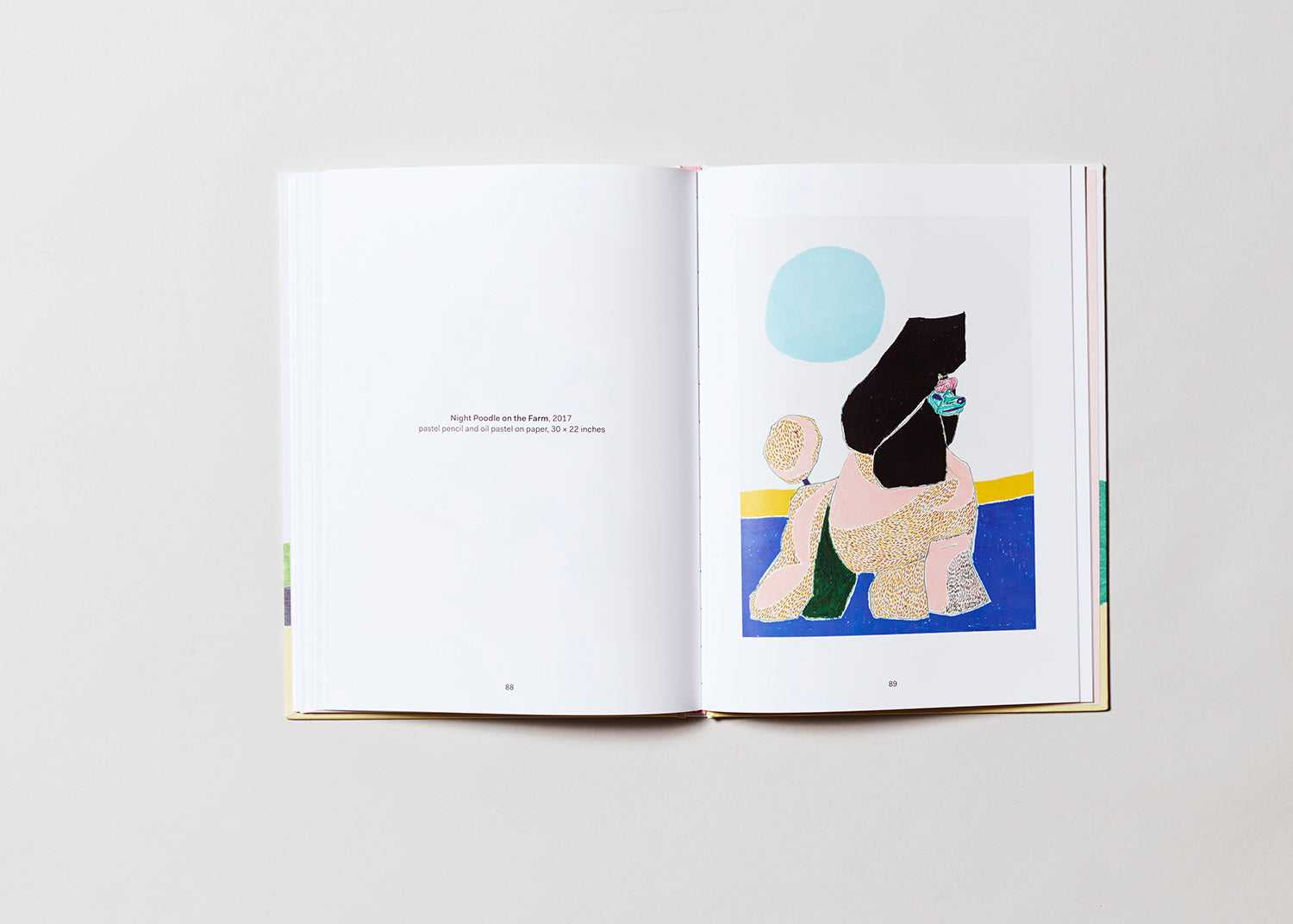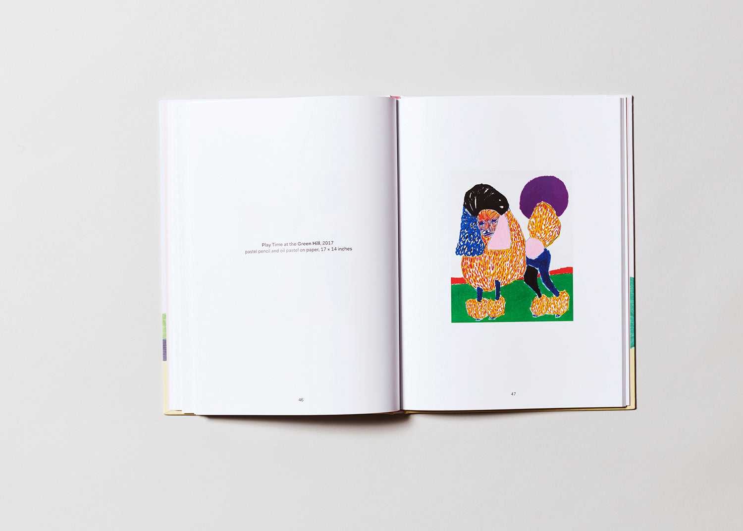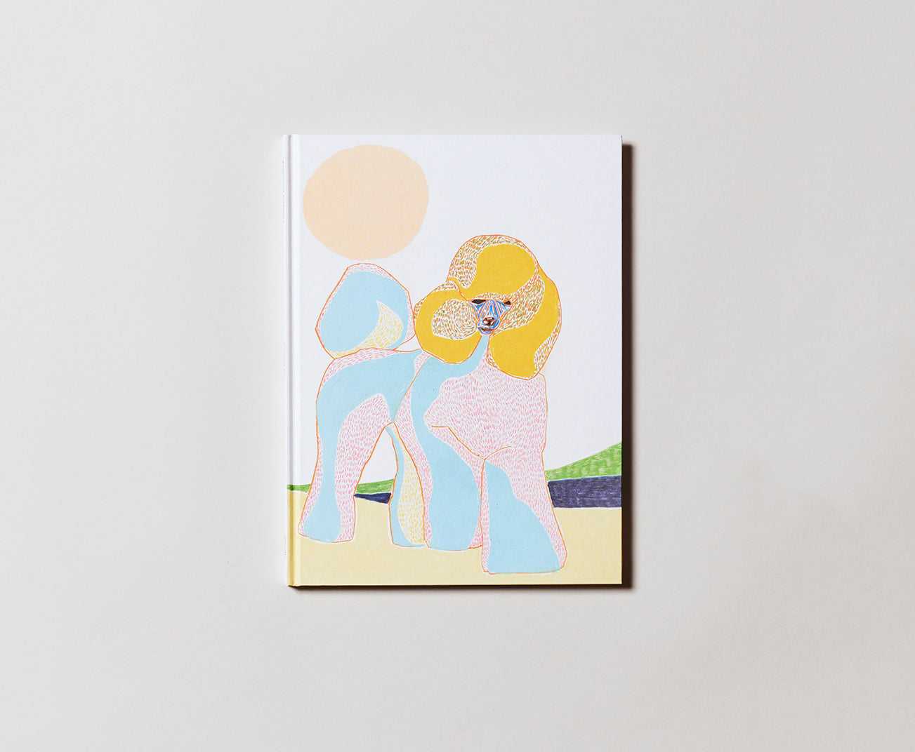 Poodles, Susumu Kamijo’s first publication, presents 48 brightly-colored drawings of poodles, based on images sourced from the Internet and dog-centric magazines. The various poodles convey subtle emotive impressions as informed by their color scheme and line-work—some appear majestic, others coy, and some more wary. Regardless of the feeling generated by each artwork, Kamijo’s combination of pastel pencil and oil pencil renders the poodle in a prismatic and playful manner.